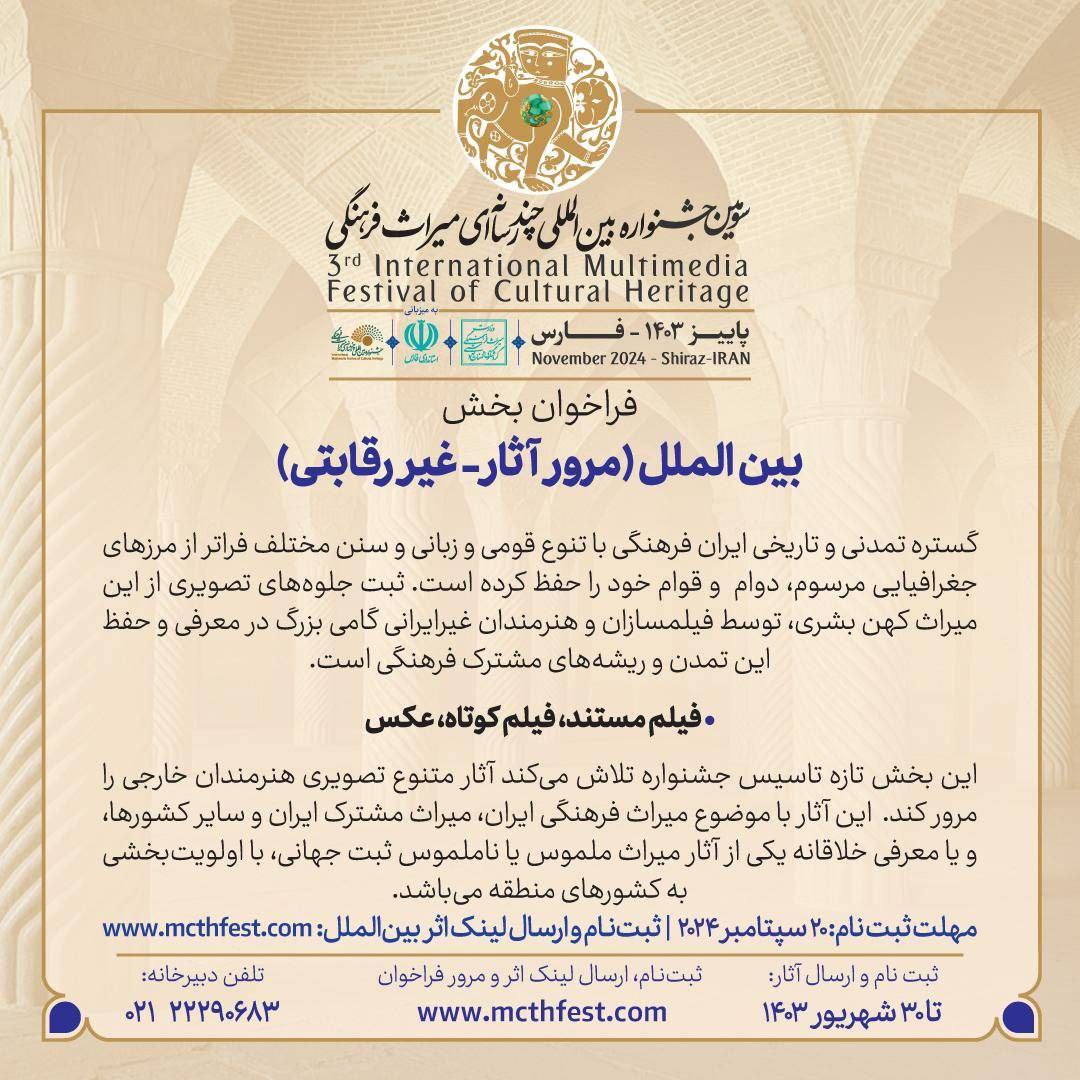 سومین دوره جشنواره بین المللی چند رسانه ای میراث فرهنگی به میزبانی استان فارس و شهر شیراز در آبان ماه 1403 برگزار میگردد.